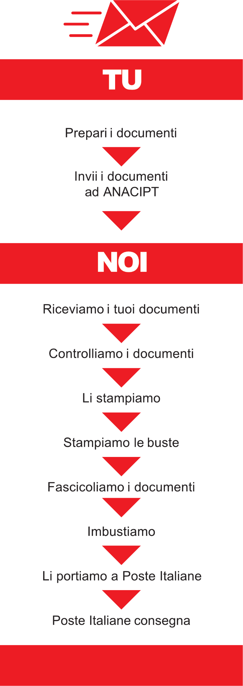 Ovvero: tu paghi solo la spedizione e non hai altri costi, né diretti (quelli per la stampa, la fascicolazione, l’imbustamento e la consegna all’ufficio postale), né indiretti (quelli del tuo personale che tutte quelle operazione doveva svolgere prima dell’arrivo di Anaci PT).